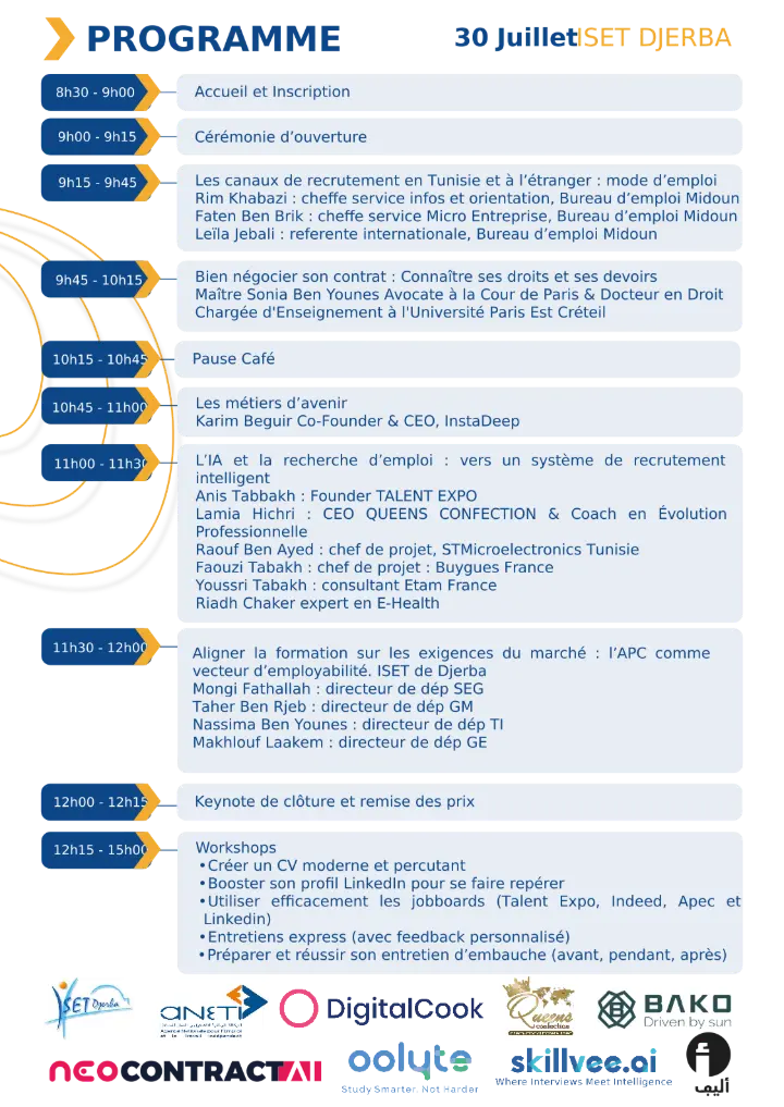 Notre événement réunit ateliers pratiques, conférences inspirantes animées par des experts, et une zone de recrutement interactive grâce à l’application Talentexpo.ai